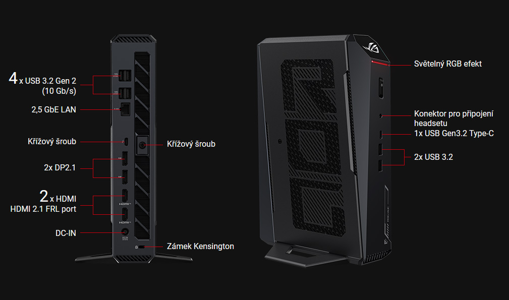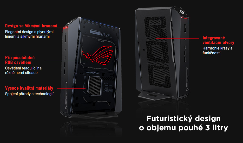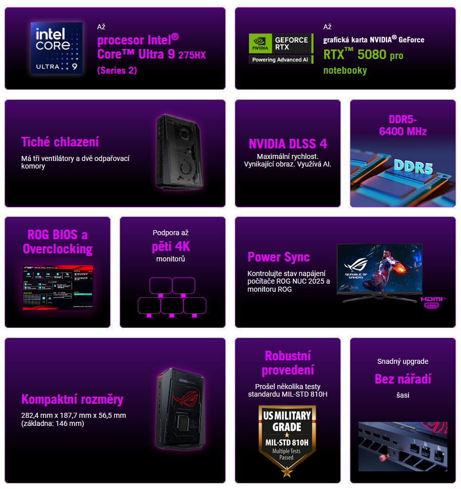 Otevřete si nové herní možnosti s mini PC ROG NUC (2025), poháněným procesory Intel® Core™ Ultra 9 (Series 2) a grafickou kartou až NVIDIA® GeForce RTX™ 5080 pro notebooky. Tento kompaktní a výkonný stroj disponuje chlazením se třemi ventilátory a podporou až pěti 4K monitorů, díky čemuž nabízí výjimečný výkon.